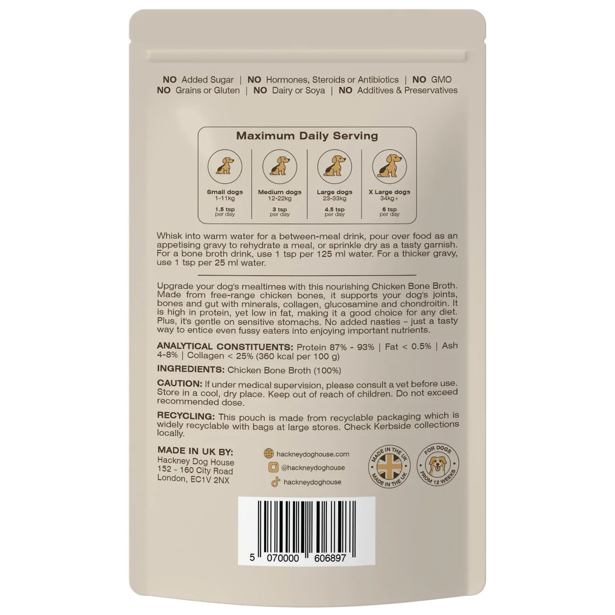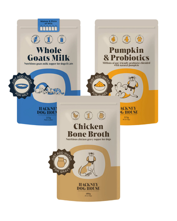 This is a bundle of 3x Hackney Dog Powder pouches, each 225g (makes up to 6 pints or 3,4 liters per bag).