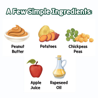 Ingredients: Peanut Butter (20%), Potato, Peas, Sweet Potato, Chickpeas, Apple Juice, Vegetable Gravy, Rapeseed Oil, Vegetable Fibre. Nutritional Additives: Antioxidants