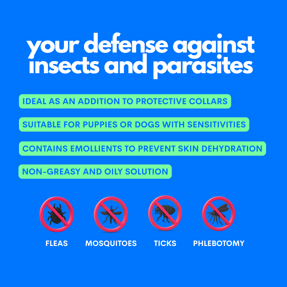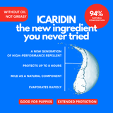 Powered by Icaridin, an innovative active ingredient already trusted in human skincare – now available for your pet’s wellness too! A non-greasy, well-tolerated alternative to traditional repellents like neem oil or pure essential oils.