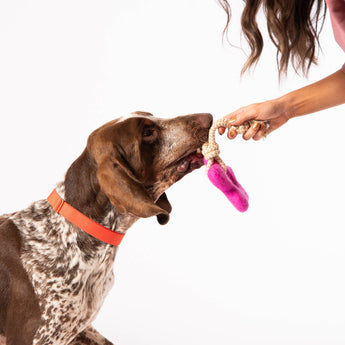 Handmade in Nepal by talented female artisans, the Pullin' Posies dog tug toy is the perfect way to bond with your furry friend while promoting dental health and stimulating play.