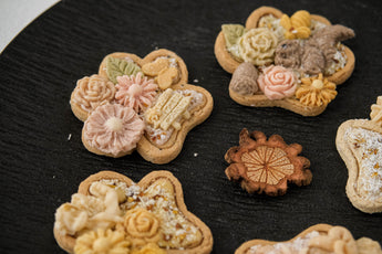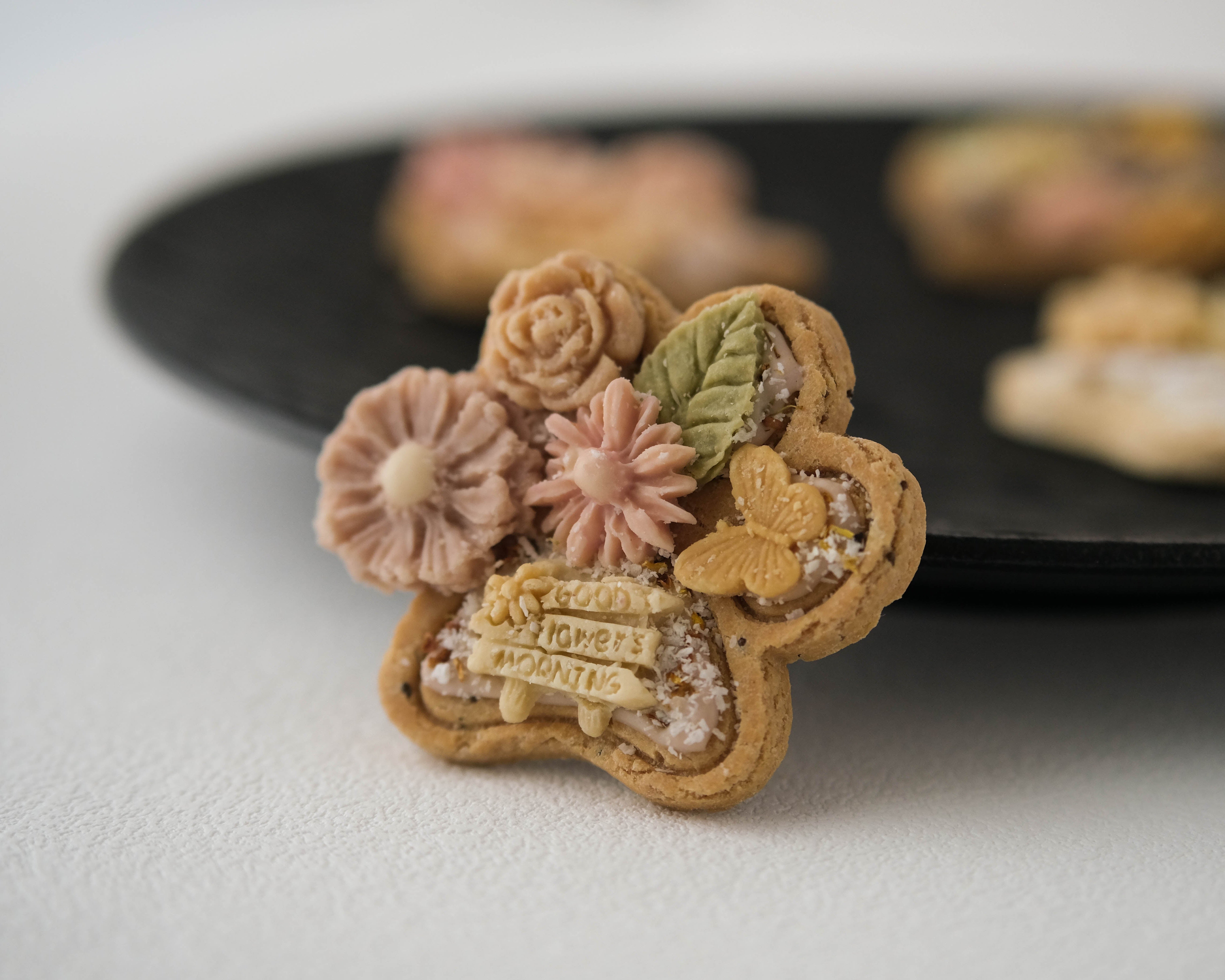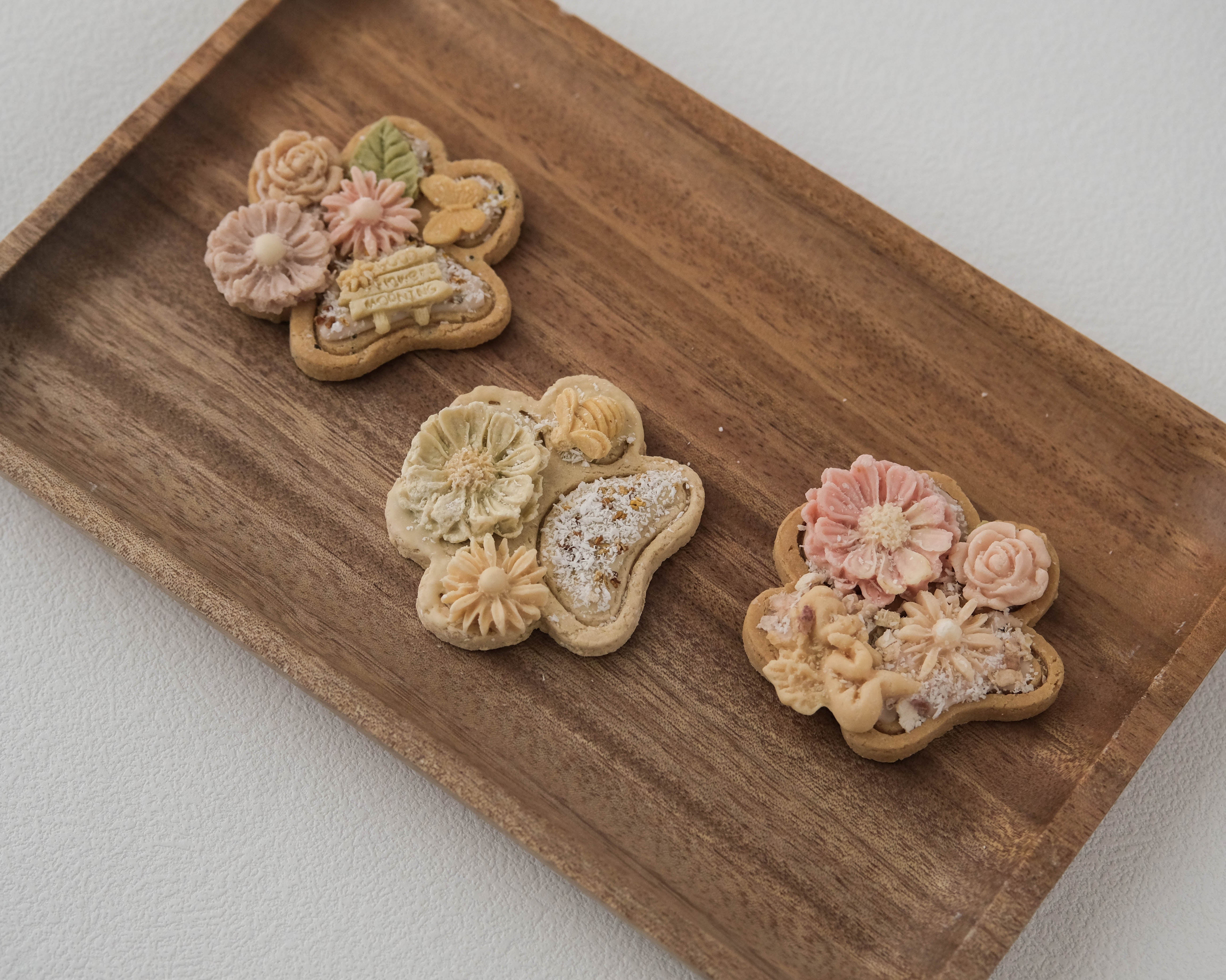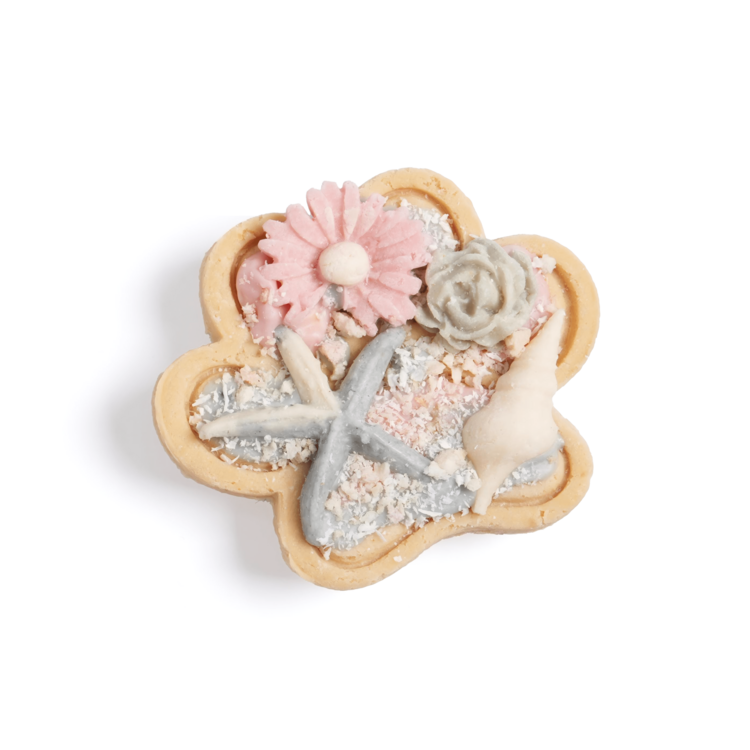 Each biscuit is topped with delicate goat milk decorations, naturally coloured with fruit and vegetable powders. Every tiny detail is placed by hand, which means no two biscuits are ever exactly the same. Each piece is its own unique little work of edible art.