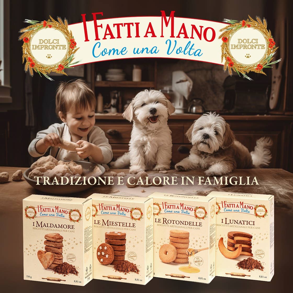 Treat your pup to a taste of Italy with these hand-made Rotondelle Shortbread Cookies. Handcrafted one by one, each heart-shaped cookie delivers authentic shortbread goodness infused with carob, pure artisanal quality. Perfect for cozy moments, gifting, or just making snack time feel fancy.