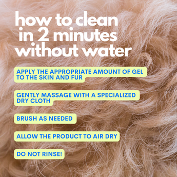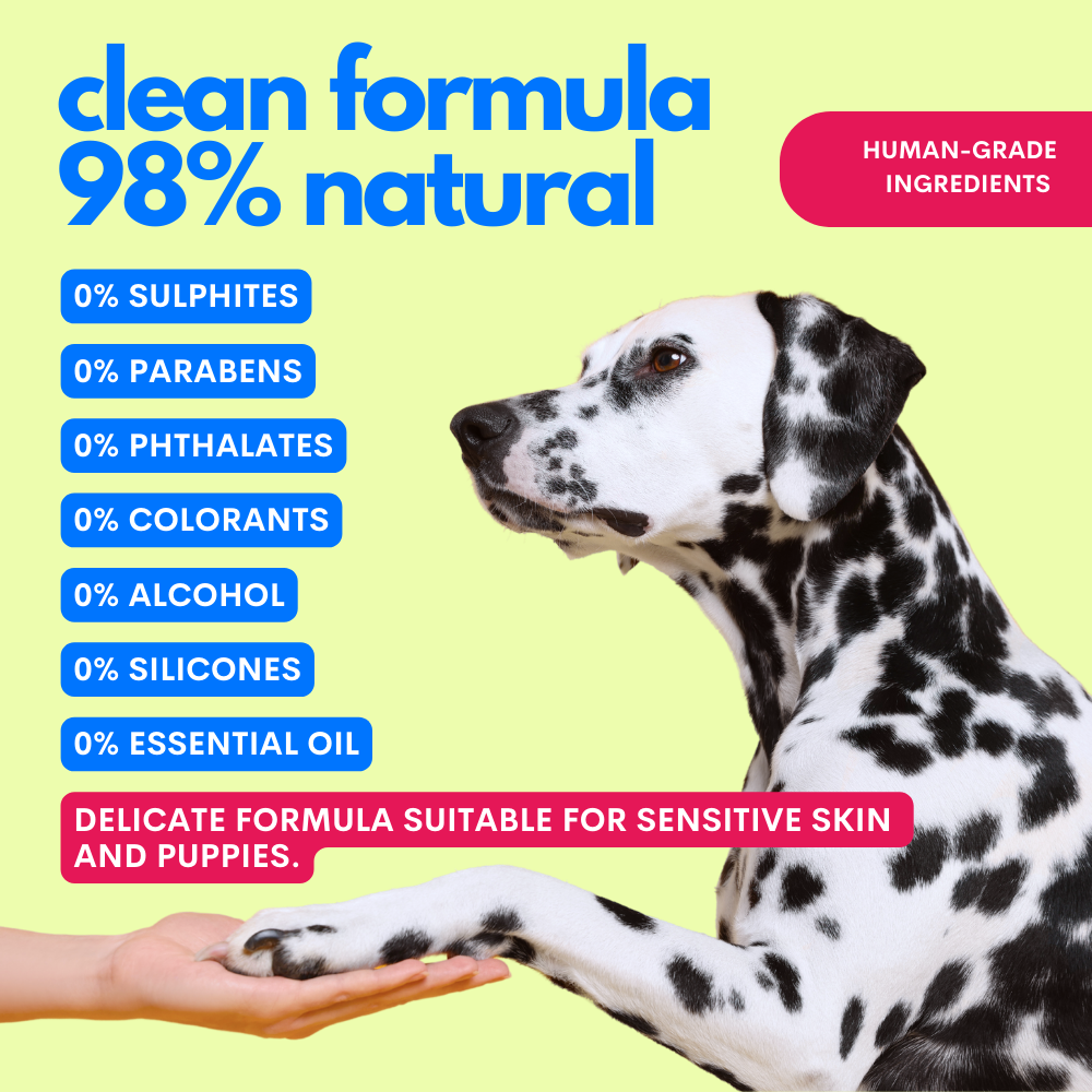 One Two Clean is a no-rinse cleansing gel with an antibacterial function, natural and vegan, designed for the daily hygiene of your dog. Formulated to sanitize your dog’s coat and fur daily (even multiple times a day).